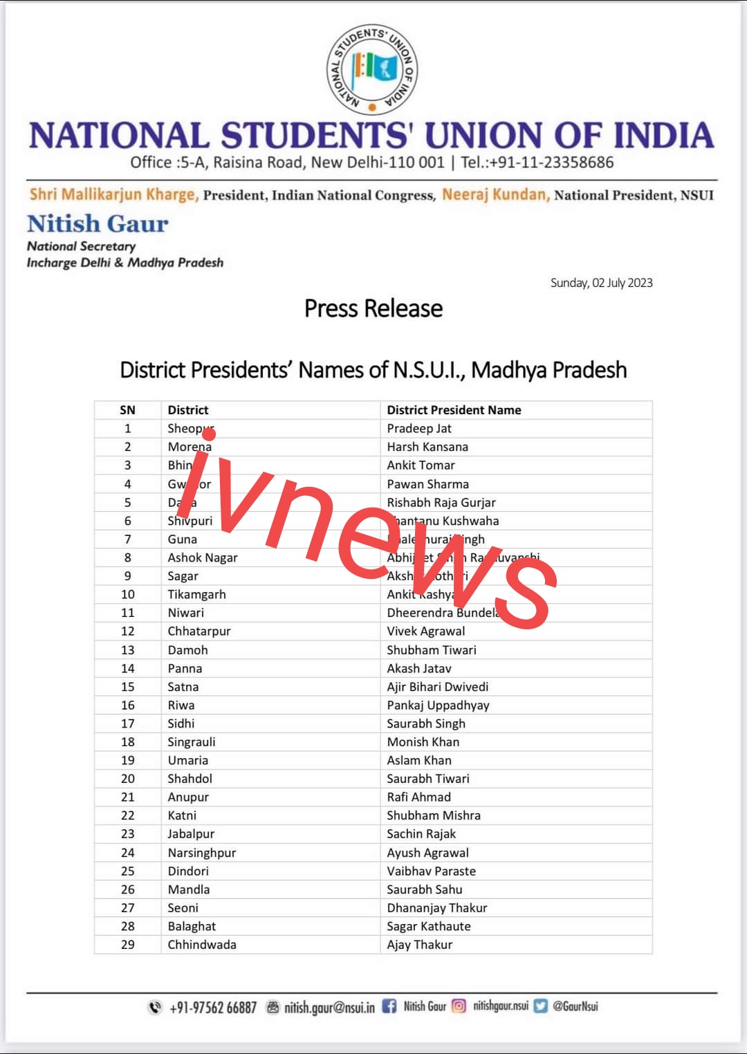 रतलाम । कांग्रेस की छात्र इकाई भारतीय राष्ट्रीय छात्र संगठन ( एन एस यु आई )ने मध्य प्रदेश में नए जिलाध्यक्षो के नाम घोषित कर दिए। रतलाम जिला एन एस यु आई अध्यक्ष राहुल शर्मा को बनाया गया है। एन एस यु आई के राष्ट्रीय सचिव एवं मध्य प्रदेश प्रभारी नीतीश गोर के हस्ताक्षर से जारी यह सूची जारी की गई है। मध्य प्रदेश के सभी 52 जिला अध्यक्षो के नामो की जारी की गई सूची देखिये।